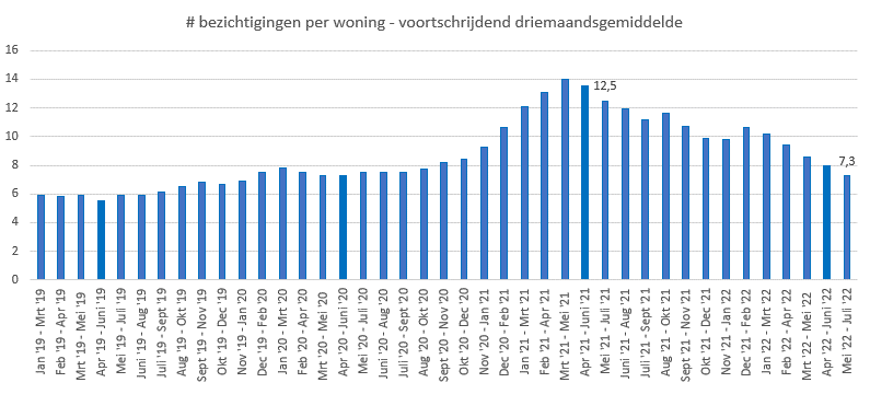 Het aantal biedingen en bezichtigingen per woning is in juli wederom teruggelopen. In de afgelopen drie maanden werd een gemiddelde woning iets meer dan zeven keer bezichtigd, waar dit vorig jaar in dezelfde periode nog ruim twaalf was. Een daling van 41,6%, zo constateert Makelaarsland uit interne cijfers. “We gaan langzaam terug naar een wat gezonder evenwicht in de woningmarkt”, zegt directeur Gijs van Wijgerden.