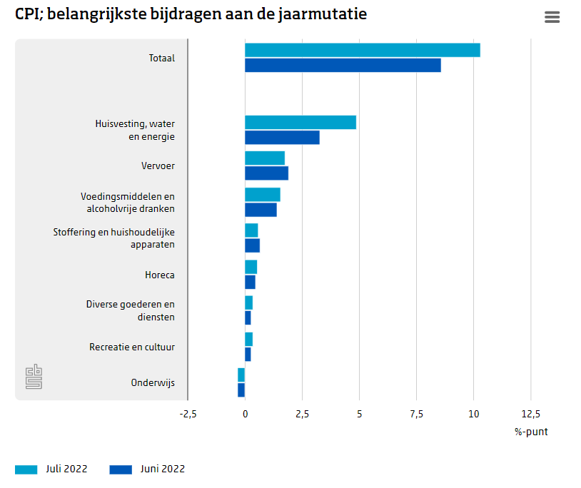 Consumentengoederen en -diensten waren in juli 10,3 procent duurder dan in dezelfde maand een jaar eerder, meldt het CBS. In juni was de inflatie 8,6%. De stijging van de inflatie kwam vooral door de prijsontwikkelingen van energie en woninghuren. De inflatie is voor het eerst na september 1975 hoger dan 10%.