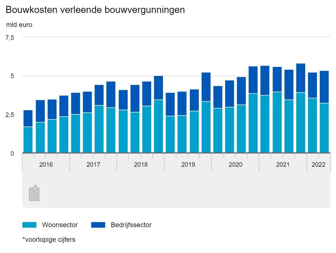De totale vergunde bouwkosten voor woningen daalden ten opzichte van het tweede kwartaal van 2021 met 17,9% naar €3,3 miljard. De bouwkosten voor de bouw van nieuwbouwwoningen daalden met 22,5% tot bijna €2,7 miljard. De bouwkosten voor de verbouw van woningen stegen juist met 11,5% tot €593 miljoen.
