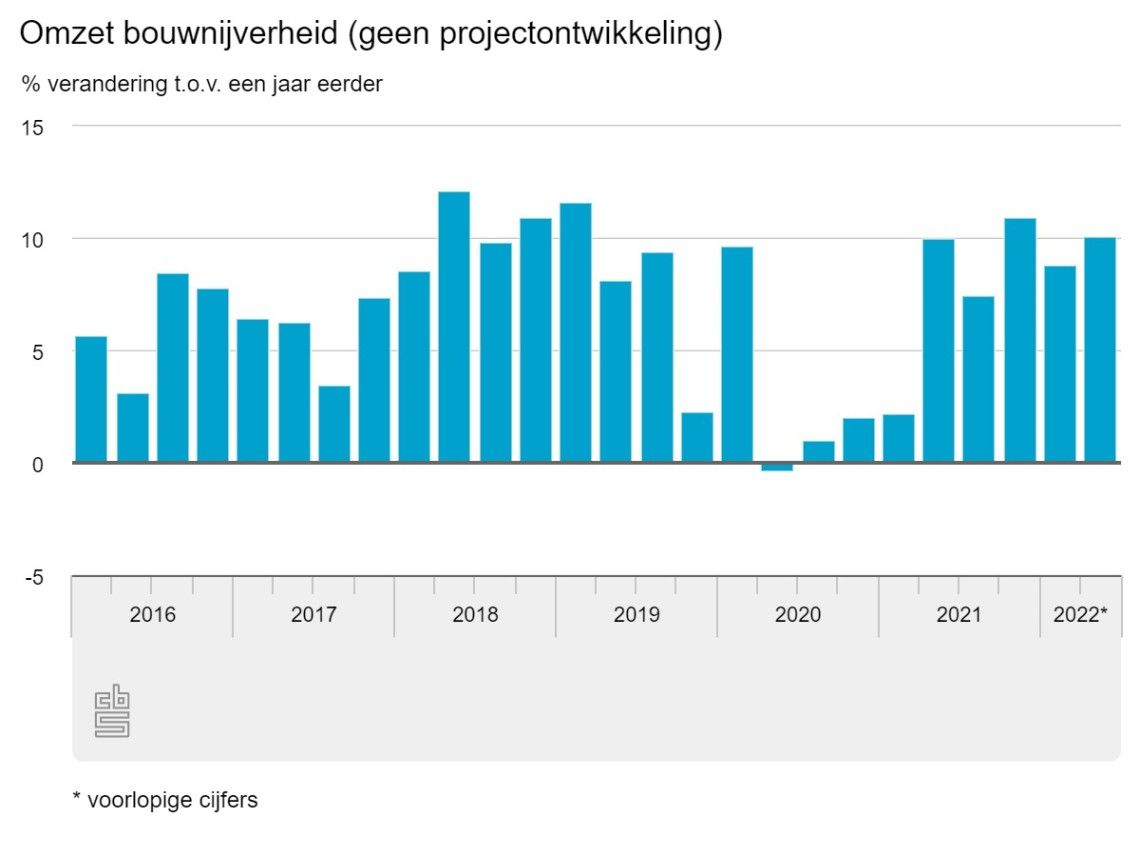 De omzet in de bouw was in het tweede kwartaal van 2022 10,1% hoger dan een jaar eerder. De afzetprijzen van de hout- en bouwmaterialenindustrie stegen met iets meer dan 16%, de omzet steeg met 15,9%. In het tweede kwartaal van 2022 werd voor 15,2 duizend te bouwen woningen een vergunning afgegeven. Dit meldt het CBS op basis van nieuwe cijfers.