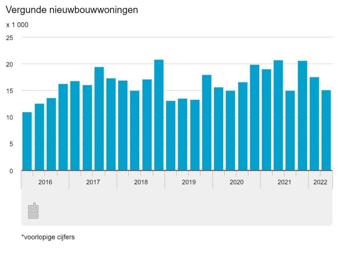 In het tweede kwartaal van 2022 werd voor 15,2 duizend te bouwen woningen een vergunning afgegeven. Dat is ruim 27% minder dan in het tweede kwartaal van 2021. Daarbij valt wel op te merken dat het aantal vergunde nieuwbouwwoningen in het tweede kwartaal van 2021 relatief hoog was. Het aantal vergunde nieuwbouwwoningen in het tweede kwartaal van 2022 is ongeveer even hoog als in het tweede kwartaal van 2020.
