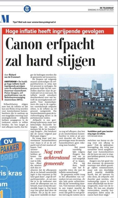 De huidige hoge inflatie heeft ingrijpende gevolgen voor de hoogte van het canon bij erfpachthouders. "Het zoveelste bewijs dat erfpacht in Amsterdam voor woningen niet veilig is", aldus erfpachtdeskundige Koen de Lange.