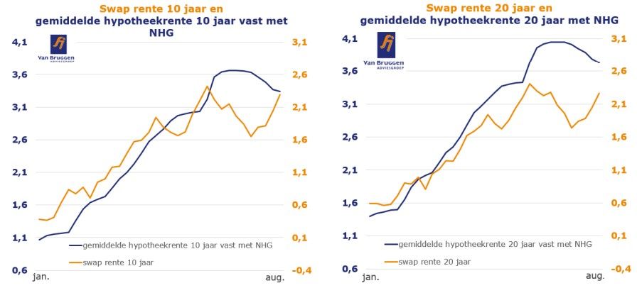 Terwijl de gemiddelde vaste hypotheekrentes de afgelopen vier weken daalden met ongeveer 0,35%, gingen de marktrentes met ongeveer 0,5% omhoog. De extra marges die de geldverstrekkers de zomermaanden genoten, zijn dan ook rap aan het slinken, aldus de Van Bruggen Adviesgroep.