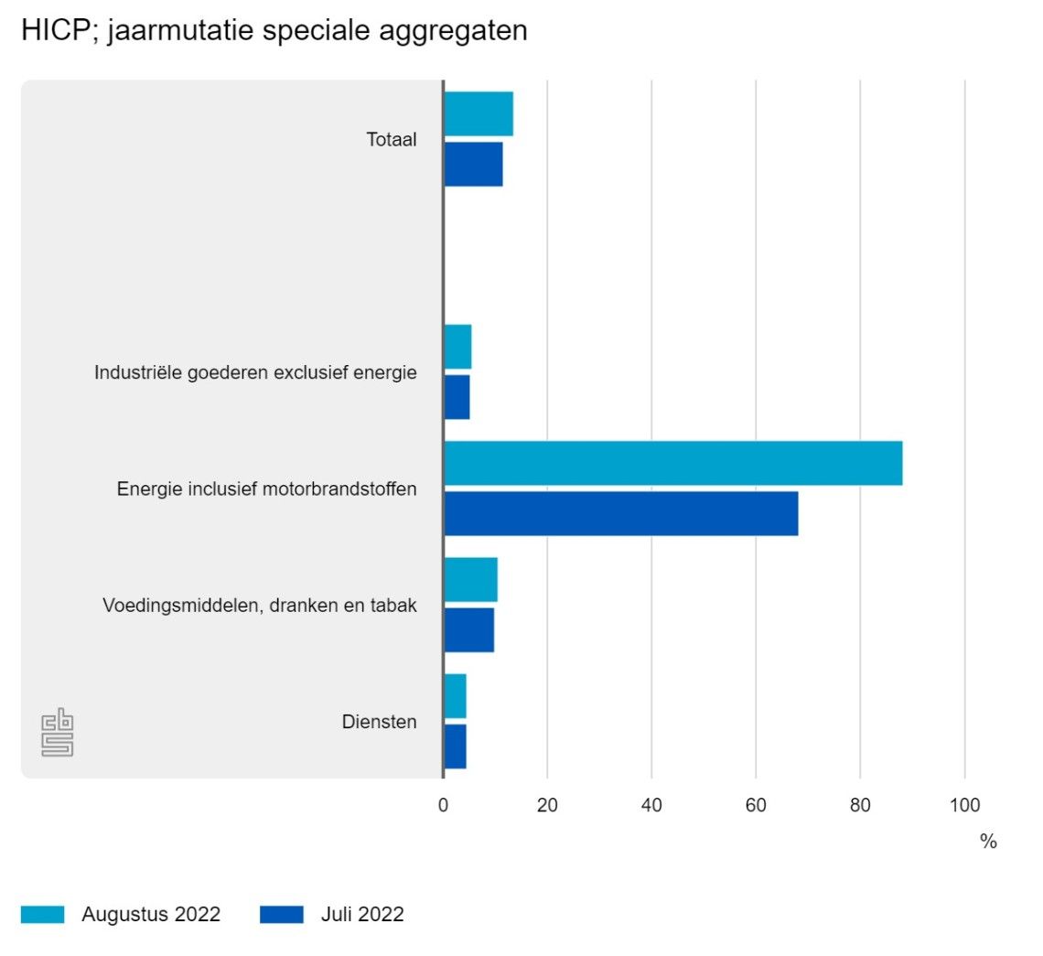 De inflatie in Nederland volgens de Europees geharmoniseerde consumentenprijsindex (HICP) was in augustus 13,6% meldt het CBS. In juli was dat 11,6%. Dit is een eerste raming op basis van nog onvolledige brongegevens. De reguliere cijfers, inclusief de inflatie volgens de Nederlandse consumentenprijsindex (CPI), worden op 6 september gepubliceerd.
