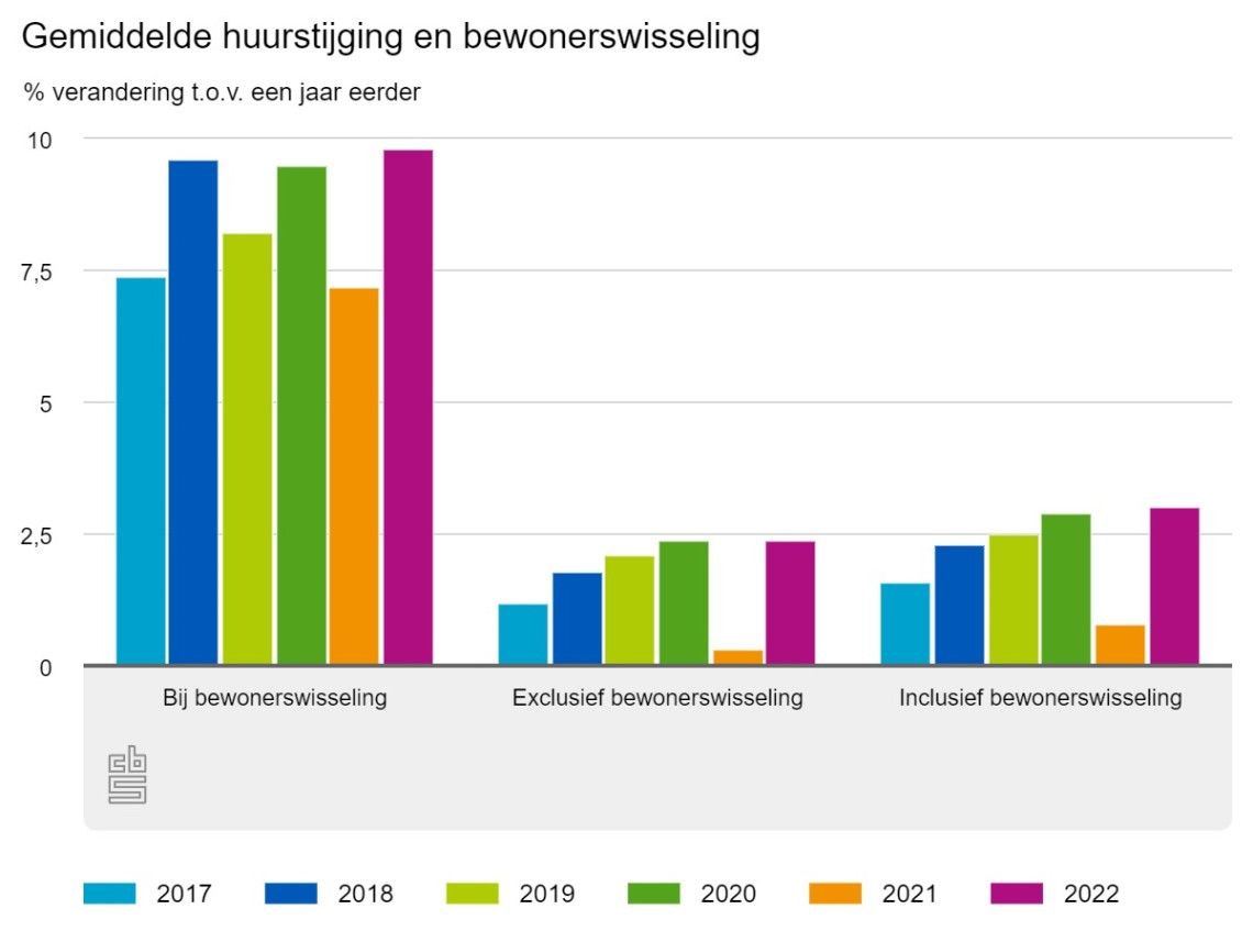 Op het moment dat een huurwoning een nieuwe huurder krijgt, is de verhuurder niet gebonden aan de vastgestelde maximale huurverhoging per jaar. Huurwoningen die tussen 1 juli 2021 en 1 juli 2022 van bewoner wisselden hadden in juli 2022 een huurprijs die gemiddeld 9,8% hoger lag dan op 1 juli 2021. Vorig jaar was deze stijging nog 7,2%. Indien geen rekening gehouden wordt met bewonerswisselingen, zijn de huren met gemiddeld 2,4 % gestegen.