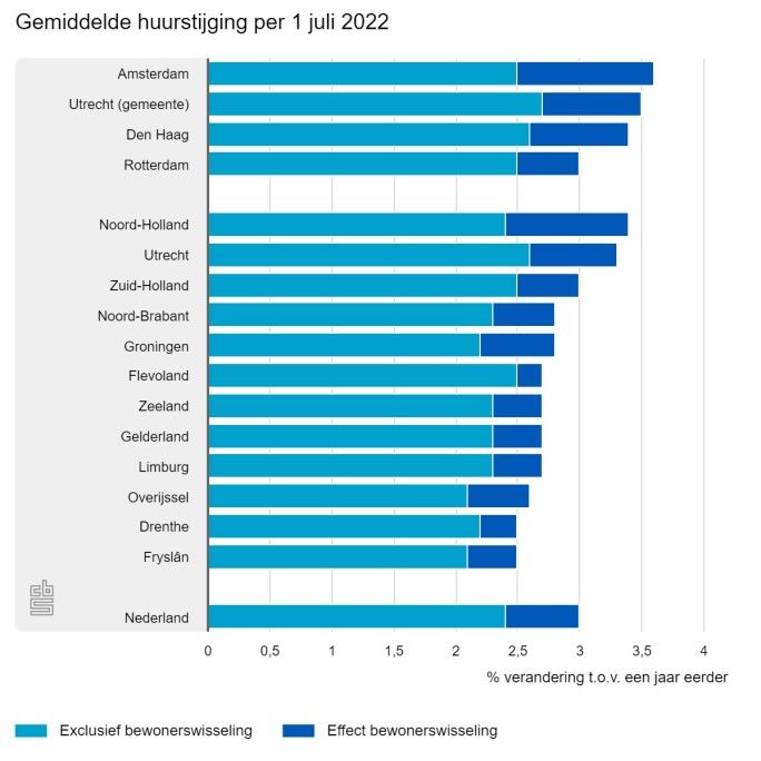 Van de vier grote gemeenten zijn de huren in Amsterdam met gemiddeld 3,6% het sterkst gestegen: de huren exclusief bewonerswisselingen stegen hier in 2022 gemiddeld met 2,5%. Het effect van bewonerswisselingen op de huurstijging is hier met 1,1 procentpunt ook het hoogst. Exclusief bewonerswisselingen stegen van de vier grote gemeenten in Utrecht de huren het sterkst, met gemiddeld 2,7%.