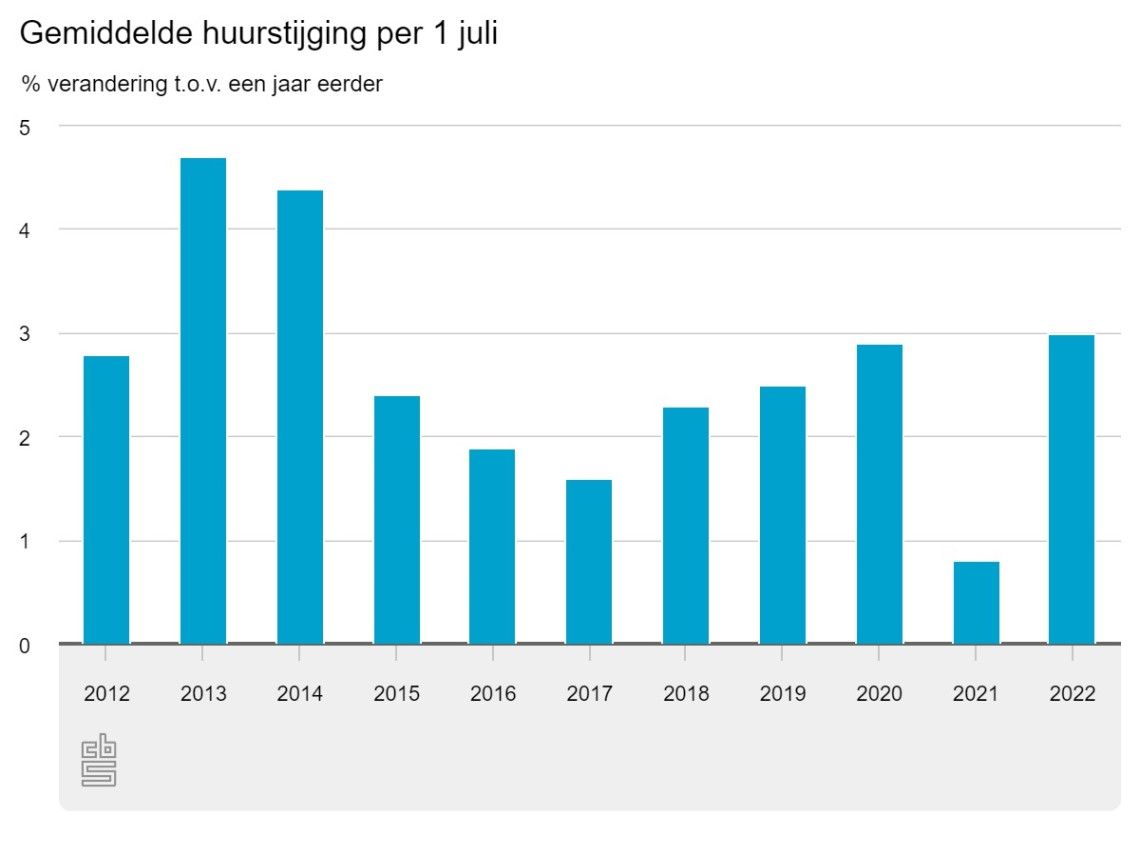 In juli 2022 waren de woninghuren gemiddeld 3,0% hoger dan een jaar eerder. Dit is de sterkste huurstijging na 2014. De huren van sociale huurwoningen stegen in 2022 gemiddeld met 2,6%, voor vrijesectorwoningen was de stijging 3,8%. Dit meldt het CBS op basis van nieuwe cijfers.