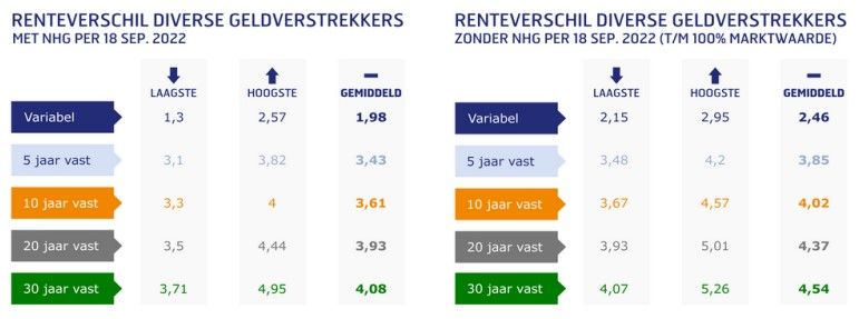 Interessant is dat degene die tussen september 2012 en september 2014 zijn of haar rente voor 10 jaar had vastgezet en niet verhuisd is of zijn hypotheek in de tussentijd niet heeft overgesloten, nog altijd een hogere rente betaalt dan de huidige rente van 3,6% voor 10 jaar vast met NHG.