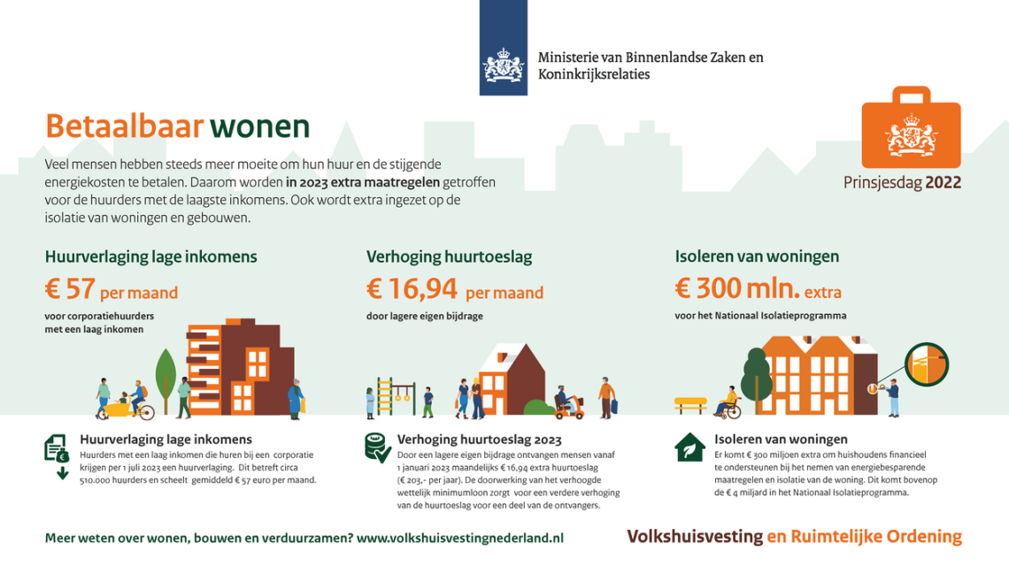Het kabinet wil de mensen die door de snel stijgende kosten financieel het meest in de knel komen extra ondersteunen in hun woonlasten. Vanaf juli 2023 krijgen huurders met een laag inkomen in een corporatiewoning een huurverlaging van gemiddeld €57 per maand. Verder stijgt vanaf 1 januari 2023 de huurtoeslag met circa €17 per maand. Om huishoudens te helpen bij het beperken van de energierekening, wordt €300 miljoen extra vrijgemaakt voor de isolatie van woningen.