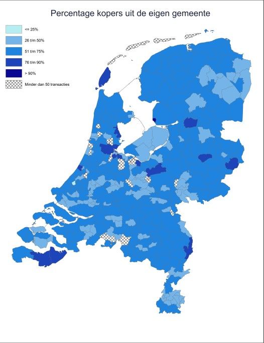 Het Kadaster onderzocht waar de kopers van verkochte woningen in de periode januari 2021 tot en met juni 2022 vandaan kwamen. In 115 gemeenten komt minder dan 50% van de kopers van bestaande koopwoningen uit dezelfde gemeente. Het gaat vaak om (kleinere) gemeenten rondom de grote steden en gemeenten in het landelijk gebied.