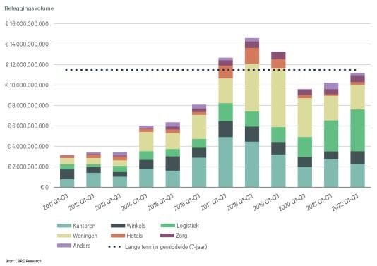 In het derde kwartaal van 2022 werd er voor €3,8 miljard in commercieel vastgoed belegd, dit is vergelijkbaar met de eerste twee kwartalen van dit jaar. In totaal is er dit jaar tot nu toe voor €11,2 miljard aan commercieel vastgoed verhandeld. Het relatief hoge niveau geeft echter een vertekend beeld van de huidige marktomstandigheden.