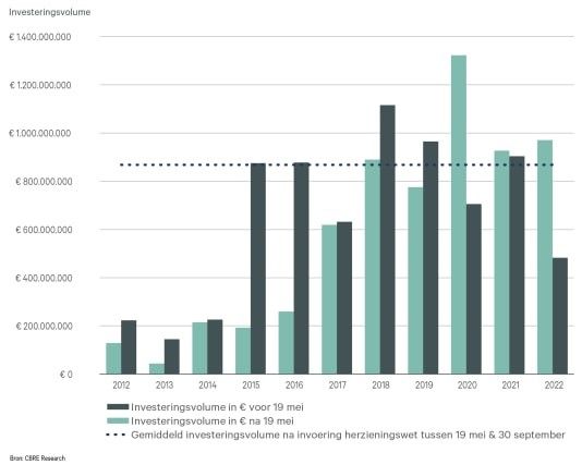 Op de woningbeleggingsmarkt ziet CBRE sinds de bekendmaking van de huurprijsregulering een forse terugval in beleggingsactiviteit. De onzekerheid over de huurregulering zorgt ervoor dat projectontwikkelaars en beleggers projecten ‘on hold’ zetten in afwachting van meer duidelijkheid over de regulering. Dit heeft er in forse mate aan bijgedragen dat het investeringsvolume bijna is gehalveerd op de nieuwbouwmarkt in verhouding tot de normale beleggingsactiviteit.