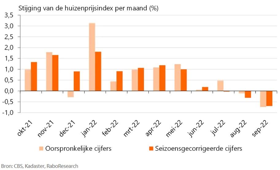 Recente cijfers van makelaarsvereniging NVM wijzen er bovendien op dat de daling in de door het CBS gepubliceerde huizenprijsindex komende maanden doorzet. De huizen waarvoor in het derde kwartaal een voorlopig koopcontract is ondertekend (en waarvan de sleuteloverdracht meestal nog moet plaatshebben) zijn volgens de makelaarsvereniging namelijk ook voor een lagere prijs verkocht.