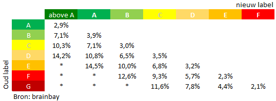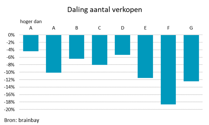 De daling van het aantal verkopen is het grootst bij de laagste labels. Van woningen met een E, F of G label werden er 12% tot 18% minder verkocht. Voor de overige labels geldt dat zij minder last hebben van de veranderde marktomstandigheden. Hier bleef de verkoopdaling beperkt tot maximaal 10%. Voor het eerst zijn ook woningen meegenomen met een label nog beter dan A, de A+ woningen. Voor deze groep bedroeg de daling van het aantal verkopen slechts 4%.