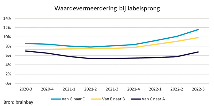 De grootste waardevermeerdering zit in de sprong van een label G naar label C. Dat verschil lag in 2021 op zo’n 8%, maar is in 2022 gegroeid naar meer dan 12%. Ook een sprong van label E naar label B laat een toename zien in waardeverschil, oplopend naar 10% in het 3e kwartaal van 2022.