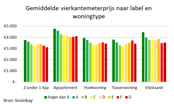 Gemiddeld kennen woningen met de beste labels de hoogste verkoopprijzen. Het verschil tussen een woning met een label hoger dan A (gemiddelde verkoopprijs ruim een half miljoen) versus een label G woning (330 duizend euro) bedraagt 185 duizend euro. Deze vergelijking is niet helemaal eerlijk. Woningen verschillen qua type en grootte, wat invloed heeft op de prijs. Maar ook daarvoor gecorrigeerd blijft het beeld staan dat hoe beter het label is, hoe hoger de verkoopprijs. Alleen voor tussen- en hoekwoningen is het beeld wat meer diffuus.