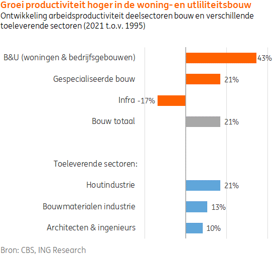Dat blijkt uit een analyse van ING Research. De bouw van woningen en bedrijfsruimten is in ruim 25 jaar meer dan 40% efficiënter geworden. Verschillende bouwbedrijven hebben de afgelopen jaren ook flink geïnvesteerd in woningfabrieken. Toch is de groei van de arbeidsproductiviteit in de bouw achtergebleven bij die van de industrie. ING Research stelt dat de bouwsector als geheel hierdoor relatief duurder is geworden en personeelstekorten hoog blijven. Dit kan ervoor zorgen dat op termijn de verduurzamingsopgave en de woningbouwopgave in de knel komen. In de infrasector is de productiviteit gedaald. Dalende productievolumes en minder mogelijkheden tot standaardisatie lijken hier vooral debet aan.