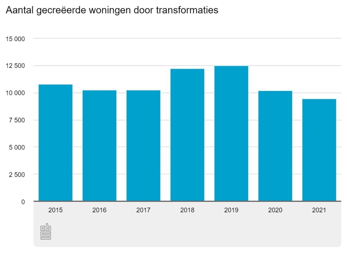 In 2021 zijn er 9.500 woningen ontstaan uit transformaties van niet-woningen, zoals kantoren en winkels. Dit is het laagste aantal in zeven jaar.