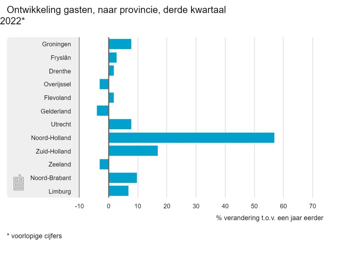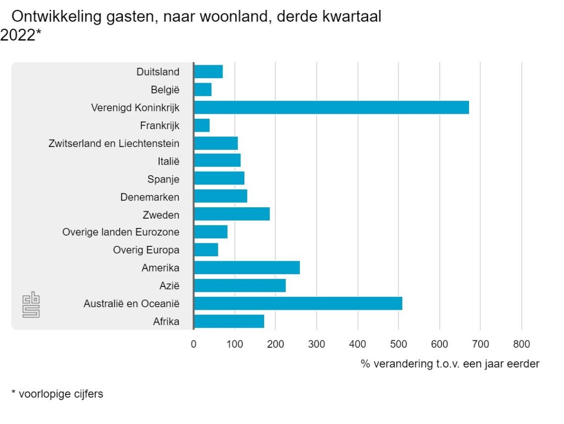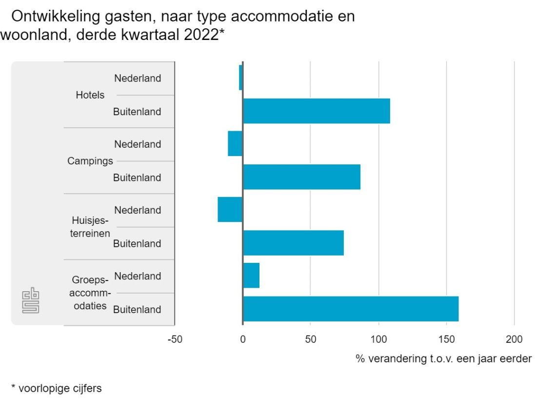 In het derde kwartaal van 2022 verbleven 5,4 miljoen buitenlandse toeristen in de Nederlandse accommodaties, een verdubbeling in vergelijking met coronajaar 2021. Het aantal buitenlandse gasten is echter nog niet op het niveau van 2019, het jaar vóór de coronapandemie. Het aantal Nederlandse gasten nam met 8 procent af naar 9,2 miljoen.