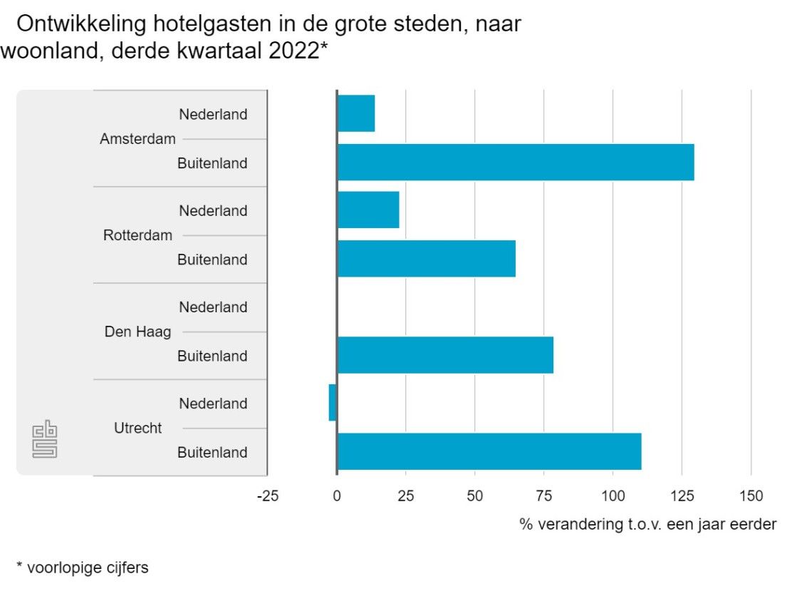 De hotels in de vier grote steden ontvingen in het derde kwartaal van 2022 meer toeristen dan een jaar ervoor. De toename loopt uiteen van 25 procent in Utrecht tot 88 procent in Amsterdam. Dit komt voor een groot deel door een stijging van het aantal buitenlandse gasten in hotels. In Amsterdam nam dit aantal het meest toe, met 130 procent naar ruim 1,6 miljoen. Hiermee is het aantal buitenlandse gasten in de Amsterdamse hotels nog niet op het niveau van 2019 (2 miljoen).