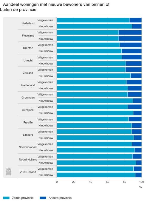 De meeste nieuwe bewoners van zowel nieuwbouwwoningen als achtergelaten woningen komen van binnen de eigen provincie. In 2020 kwamen 3,7 duizend woningen vrij door de realisatie en bewoning van nieuwbouw die bewoners trokken van buiten de eigen provincie. 3 duizend van deze bijbehorende gerealiseerde nieuwbouwwoningen trokken bewoners van buiten de provincie. Gemiddeld komen er naar verhouding minder mensen van buiten de provincie naar nieuwbouw dan naar de woningen die daardoor vrijkomen.