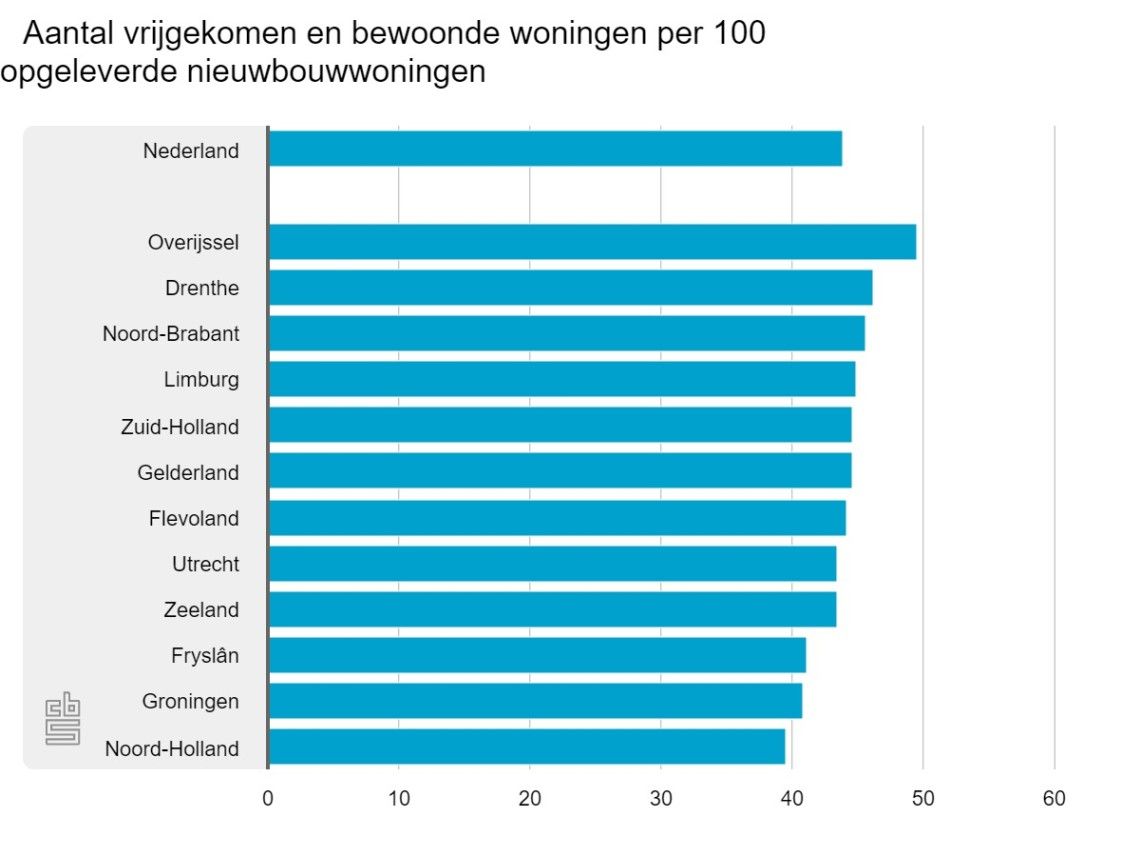 De realisatie van 100 nieuwbouwwoningen leidde tot het vrijkomen en opnieuw bewoond worden van 44 andere woningen in 2020. Dit aandeel kan nog oplopen wanneer alle vrijgekomen woningen alsnog bewoond worden. In Noord-Holland was er in 2020 de minste doorstroom. Per 100 nieuwbouwwoningen werden er nog geen 40 vrijgekomen woningen bewoond. In Overijssel was de doorstroom het grootst met bijna 50 bewoonde vrijgekomen woningen per 100 opgeleverde nieuwbouwwoningen.