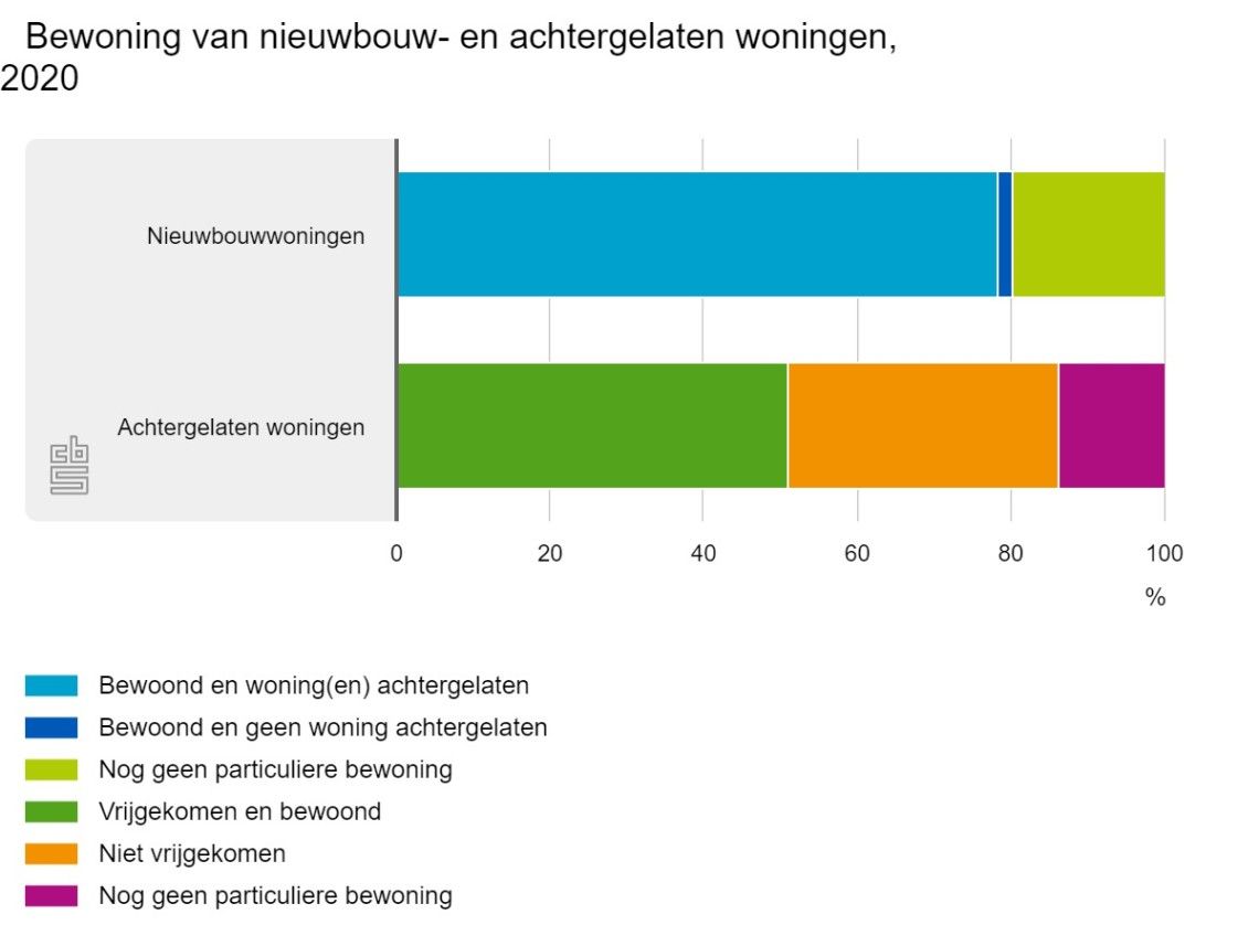 Van de bijna 70 duizend nieuwbouwwoningen die in 2020 zijn opgeleverd, waren 56 duizend eind 2020 bewoond. Die nieuwe bewoners verlieten bij elkaar 60 duizend woningen, waarvan twee derde vrij kwam voor bewoning door andere huishoudens. Iets meer dan de helft van deze woningen waren eind 2020 weer bewoond. Kortom: nieuwbouw zorgen voor doorstroming op de markt.