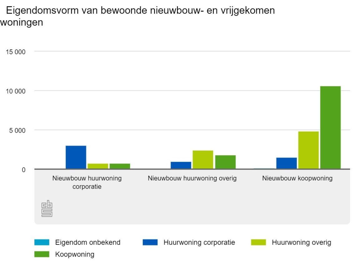 Huishoudens die een woning achterlieten voor een nieuwbouwwoning veranderden weinig van eigendomsvorm. De helft van de vrijgekomen woningen zijn koopwoningen. De meeste van deze vrijgekomen koopwoningen kwamen vrij door nieuwbouw koopwoningen (80 procent). Oplevering en bewoning van een nieuwbouw koopwoning leidde tot het vrijkomen van 17 duizend woningen, waarvan 63 procent koopwoningen. Van alle nieuwbouw levert het opleveren en bewonen van koopwoningen niet alleen absoluut de meeste vrijgekomen woningen op. Per 100 bewoonde nieuwbouwkoopwoningen kwamen er 57 woningen vrij. Voor zowel huur overig als corporatie waren dit 40 vrijgekomen woningen per 100 bewoonde nieuwbouwwoningen.
