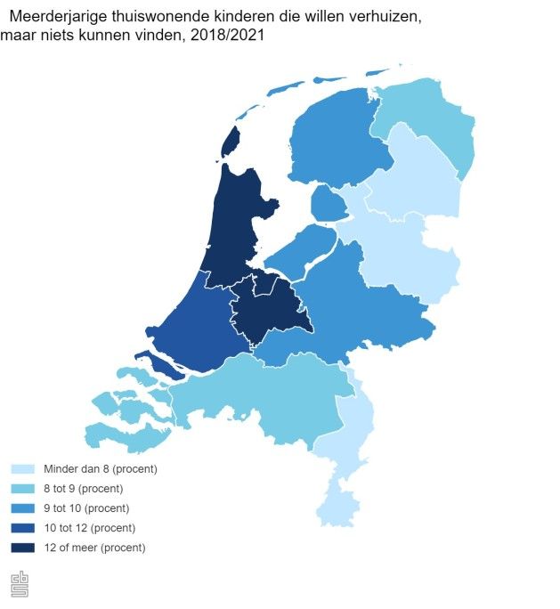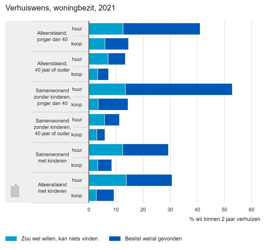 Volgens een analyse van CBS en WoonOnderzoek Nederland wilden bijna 900 duizen mensen in 2021 verhuizen, maar konden geen woning vinden. Dat waren er ruim twee keer zo veel als in 2015, met vooral jongeren (13%) en alleenstaanden (12%) die het onmogelijk vonden om een nieuwe woning te vinden.
