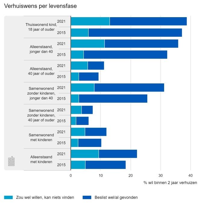 Na de thuiswonende kinderen hebben alleenstaanden jonger dan veertig jaar het vaakst een stellige verhuiswens (ze willen binnen twee jaar beslist verhuizen, hebben al wat gevonden of willen verhuizen maar kunnen dat niet). Ook in deze groep nam het aandeel dat wel wilde maar niet kon verhuizen toe: van 4 procent in 2015 naar 11 procent in 2021.
