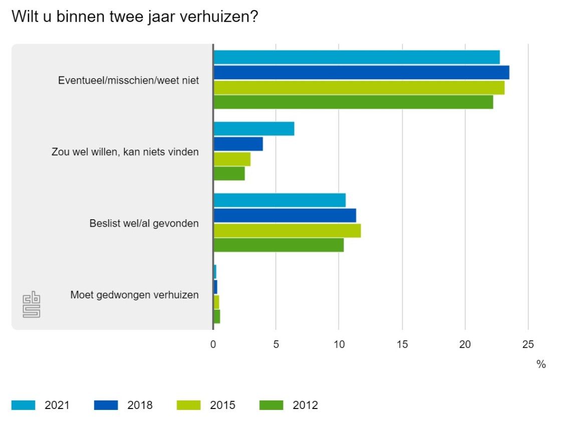 Het WoON is een driejaarlijkse enquête van het CBS en het ministerie van Binnenlandse Zaken en Koninkrijksrelaties (BZK). Het aantal respondenten varieerde van 47 duizend in 2021 tot 69 duizend in 2012. In de enquête is volwassenen onder andere gevraagd of zij binnen twee jaar willen verhuizen. In 2021 zei 11 procent beslist te willen verhuizen, 23 procent wilde misschien verhuizen. Deze percentages zijn sinds 2012 vrij stabiel. De groep die wel wil verhuizen maar niets kan vinden verdubbelde ruim. In 2015 gaf bijna 3 procent van de respondenten dat antwoord, in 2021 ruim 6 procent. Dat komt neer op een toename van bijna 400 duizend mensen in 2015 tot bijna 900 duizend in 2021.