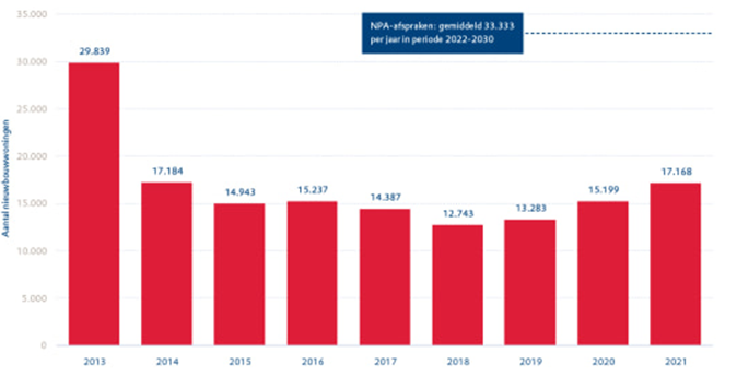 De nieuwbouw in 2021 bestond uit 16.288 reguliere woningen en 880 intramurale zorgwoningen. Corporaties bouwden meer meergezinswoningen dan in het voorafgaande jaar en juist minder eengezinswoningen. Het aantal woningen als gevolg van transformaties van bijvoorbeeld kantoorpanden of scholen nam toe.
