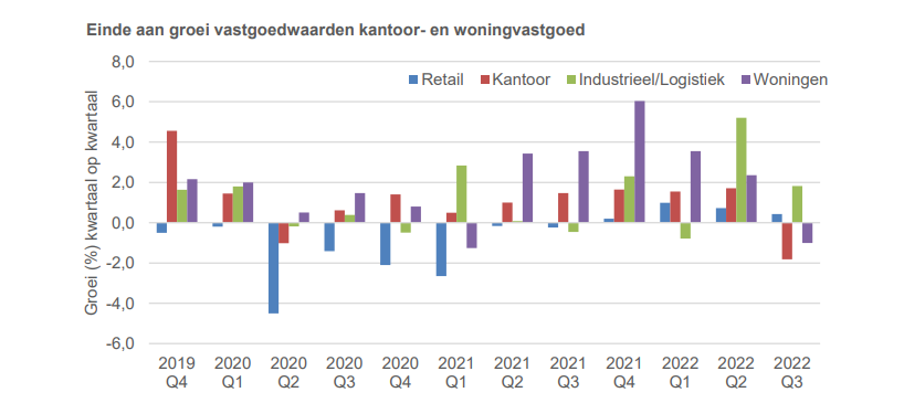 Na een lange periode van groeiende vastgoedwaarderingen is voor kantoren en woningen voorlopig het hoogtepunt bereikt. In het derde kwartaal noteerden de waarden van kantoor- en woningvastgoed dalingen van respectievelijk 1,8 procent en 1 procent ten opzichte van het vorige kwartaal.