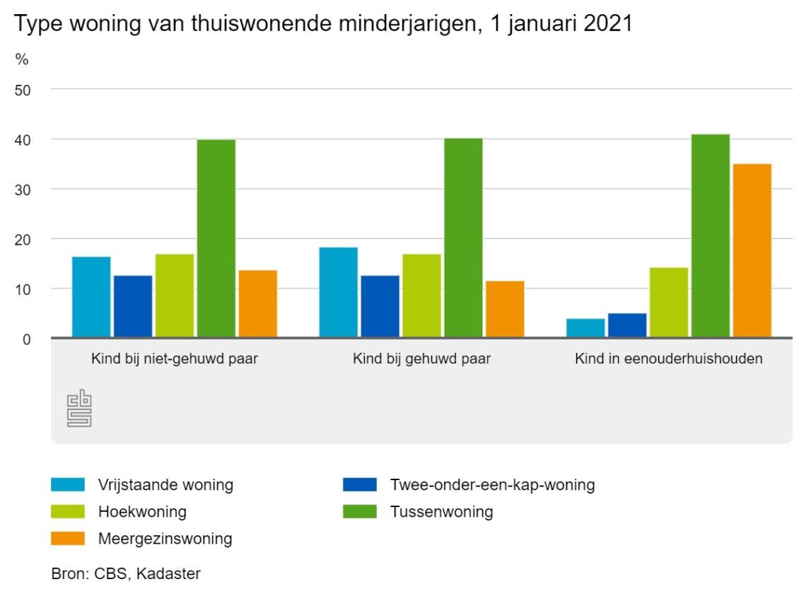 Thuiswonende kinderen (tot 18 jaar) woonden het vaakst in een tussenwoning. Het maakt daarbij niet uit of ze bij gehuwde ouders, niet-gehuwde ouders of in een eenoudergezin wonen. Vooral in Amsterdam woonden veel thuiswonende minderjarige kinderen in een meergezinswoning (75 procent). Ook in Den Haag (59 procent), Rotterdam (56 procent) en Schiedam (50 procent) was dat het geval, in Utrecht lag dit aandeel een stuk lager (27 procent). In de gemeente Rozendaal woonde geen enkel thuiswonend kind in een meergezinswoning. In niet stedelijke gemeenten woonden relatief veel kinderen (42 procent) in een vrijstaande woning, en slechts 3 procent in een meergezinswoning. In zeer sterk stedelijke gemeenten was dat juist andersom.