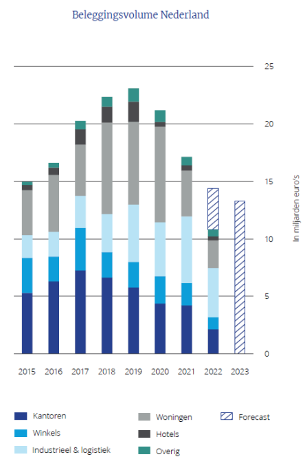 Volgens de prognose van Colliers wordt er volgend jaar 13,3 miljard euro in Nederlands vastgoed geïnvesteerd. Dat is ruim 1 miljard minder dan dit jaar. Tussen 2017 en 2020 ging het nog om bedragen van boven de 20 miljard euro.