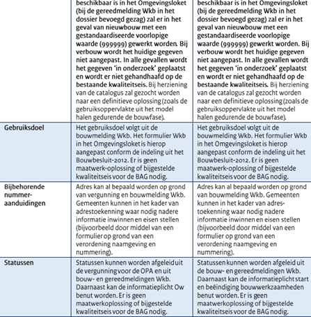 In de beschreven oplossingen zullen in specifieke situaties afwijkende kwaliteitseisen gaan gelden tot het moment dat bepaalde informatie wel beschikbaar is. Dit kan leiden tot gewijzigde kwaliteitseisen voor bovengenoemde objecten en attributen in de kaders kwaliteit- en toezicht voor de BAG. In de factsheet wordt opgemerkt dat het streven blijft dat de noodzakelijke informatie voor processen bij gebruikers (zowel binnen als buiten de gemeente) zoveel mogelijk op tijd beschikbaar is.