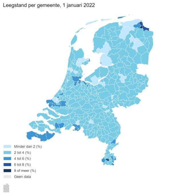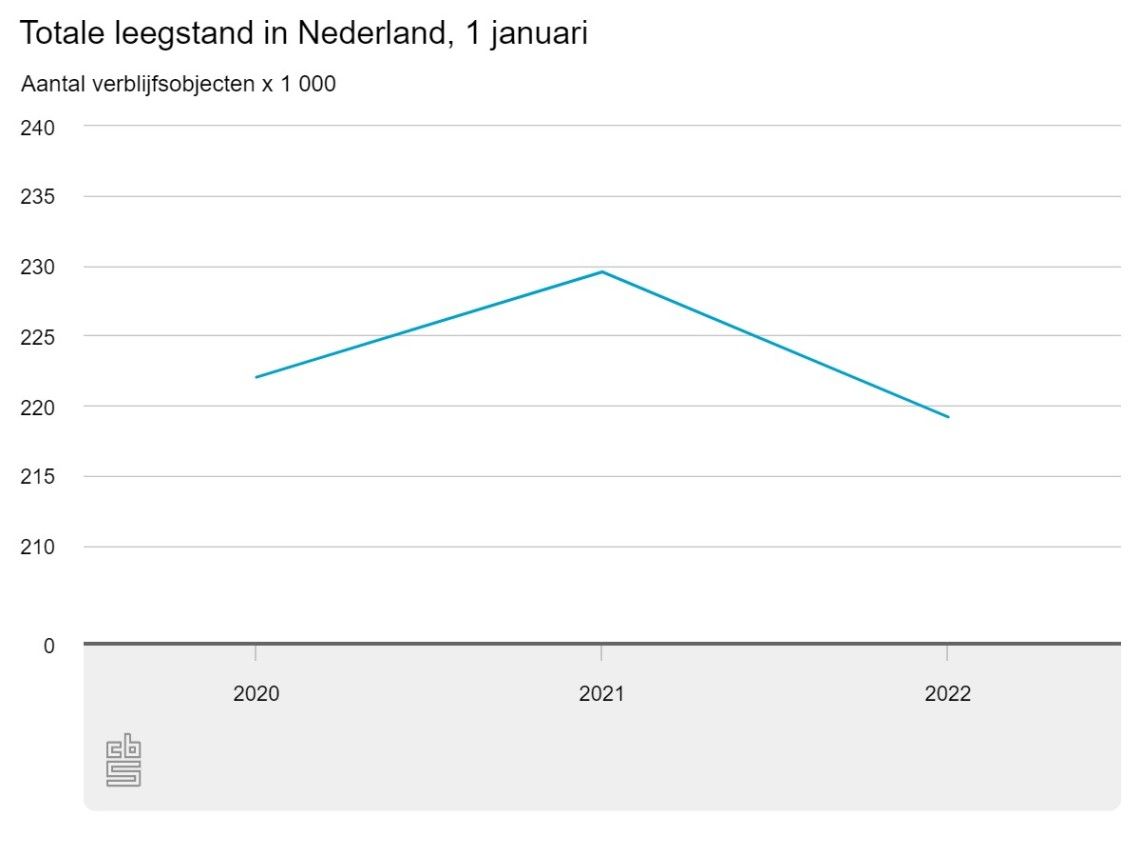 De leegstand van onder andere woningen, kantoren en winkels in Nederland is in vergelijking met een jaar eerder met ruim 10 duizend afgenomen naar 219 duizend objecten op 1 januari 2022. Dit blijkt uit nieuwe cijfers van het CBS.