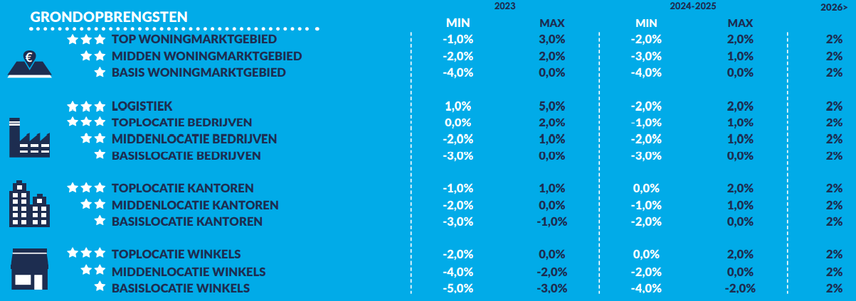De grondprijzen voor woningbouw, kantoren en winkels zullen het komende jaar iets gaan dalen. De prijzen voor al het vastgoed zal vanwege de oplopende rente gaan dalen, maar op toplocaties minder hard dan op perifere locaties. Tegelijk is de verwachting dat de bouwkosten zullen stijgen. Dit tezamen leidt tot lagere residuele grondwaarden en een (theoretische) daling van de grondprijzen.