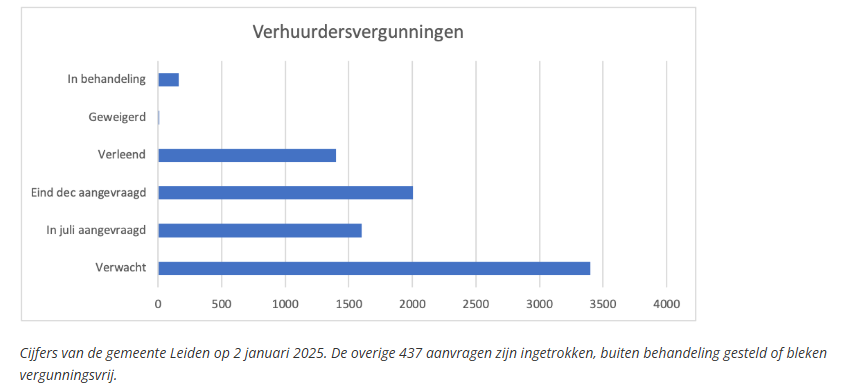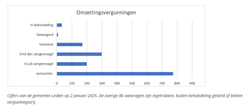 Van die vergunningen zijn er nog steeds veel minder aangevraagd dan de gemeente Leiden had verwacht. Slechts maximaal een kwart van de verwachte omzettingsvergunningen is verleend, en bij verhuurdersvergunningen gaat hem om net iets minder dan de helft. Met het begin van het nieuwe jaar is er opnieuw een gemeentelijke deadline verstreken om de omzettingsvergunning aan te vragen.