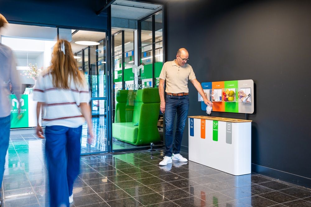 Scheiden aan de bron is daarbij zeer belangrijk, net zoals de kwaliteit van het afval. Dennis: 'Dat laatste is bepalend voor hoe goed je het kunt hergebruiken. Scheiden aan de bron scheelt een hoop moeite, tijd en energie in het verwerkingsproces en is bepalend voor het hergebruik van de grondstoffen. Voor karton is het bijvoorbeeld heel belangrijk dat het schoon en droog is, anders wordt het downcycling in plaats van recycling. Met bronscheiding zorg je ervoor dat de kwaliteit van het recyclaat zo hoog mogelijk is.' Milieu Service Nederland werkt in kantooromgevingen daarbij met zogenaamde MAC’s, Multi Afval Containers, waarmee afvalstromen zoals papier, organisch afval en plastic, metaal en drankkartons (PMD) gescheiden kunnen worden ingezameld van het restafval. 'Door circulaire afvalstromen gescheiden in te zamelen, houden we waardevolle grondstoffen in de keten. Hiervan kunnen we weer 100 procent nieuwe producten maken. Wij werken daarbij ook met de internationale kleurcodering in de inzamelingsketen, waardoor het voor iedereen, ook voor de schoonmakers, in één oogopslag duidelijk is waar wat in hoort.'