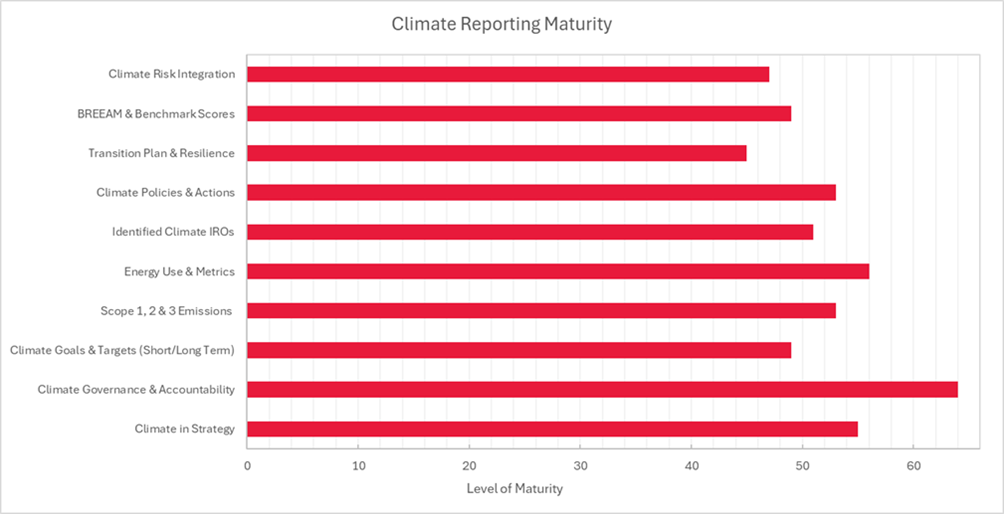 De volwassenheid van klimaatrapportages werd beoordeeld aan de hand van tien kerncriteria. Daarbij werd gekeken naar zowel de aanwezigheid als de diepgang van de klimaatgerelateerde informatie. De analyse bracht diverse opvallende trends en inzichten aan het licht over de uiteenlopende niveaus van rapportagevolwassenheid.